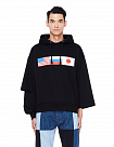 Худи Gosha Rubchinskiy с фирменными принтами в виде флагов — этот мотив стал одним из основных в последней коллекции Гоши Рубчинского. Модель свободного кроя oversize сшита из плотного хлопка черного цвета. Широкие рукава, один из которых двойной, а другой укороченный. Низ и манжеты с эластичными резинками. В комплект к худи можно подобрать любые треники того же бренда.