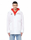 Ветровка из подиумной коллекции, часть которой Гоша Рубчинский создал совместно с Adidas в преддверии чемпионата мира по футболу в 2018 году. Выполнена из полиэстера белого цвета. Спереди – логотип Adidas и надпись 'Гоша Рубчинский', на плечах – три черные полоски, часть фирменного стиля Adidas. Капюшон с козырьком. Два накладных кармана с клапанами на заклепках. Ветровка застегивается на молнию и на заклепки. Носите с худи и джинсами. Данная модель также доступна в черном цвете.