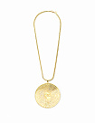 Золотистое колье из меди с круглым кулоном в виде древнегреческого узора, имитирующего лабиринт минотавра, и логотипом бренда по центру. Оборотная сторона медальона гладкая. Подвеска на цепочке-шнурке напоминает большую монету, найденную в археологических раскопках. Аксессуар подойдет как мужчинам, так и женщинам, он украсит и строгий, и расслабленный образ.