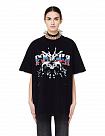 Хлопковая футболка оверсайз из коллекции Vetements SS'19. Модель сшита в комбинированной технике — передняя часть черного цвета с аппликацией и принтом в виде надписи «Россия», а спинка с камуфляжным узором дополнена нашивкой «America». Смотрите другие футболки Vetements на странице бренда.